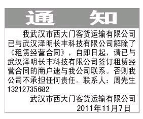 《解除租赁合同声明登报》武汉市公告登报哪个报纸便宜