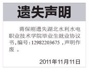 《大学毕业生就业协议书登报格式》武汉大学毕业生就业协议书遗失声明怎么登报 三方协议遗失声明 三方协议补办声明