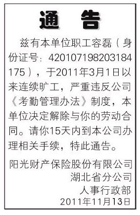 《通告登报格式》通知员工 办理离职手续登报格式