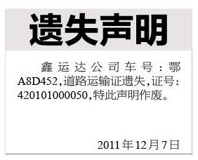 (道路运输证遗失声明登报)|武汉市车辆道路运输证遗失声明登报格式