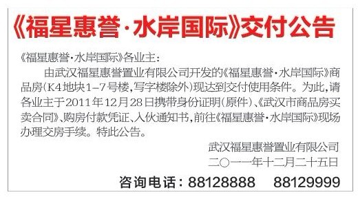 (交房公告)《福星惠誉·水岸国际》交付公告登报 武汉交付公告登报格式 交房公告登报怎么办理