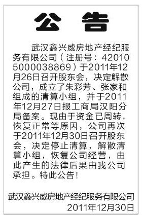 (公司恢复经营 解散清算小组 撤销注销备案)登报公告模板|公司恢复经营登报公告格式