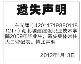 (集体常住人口登记表丢失声明)遗失声明登报 湖北省大学毕业生户口登记表丢失声明登报模板 怎么办理户口遗失声明 武汉市遗失声明登报