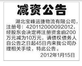 (企业减资登报公告)先登报 再付款 减资公告登报费用200块 减资公告登报 公司减资登报公告