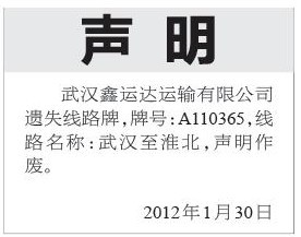 (道路线路牌遗失声明登报)武汉市 线路牌遗失声明登报模板