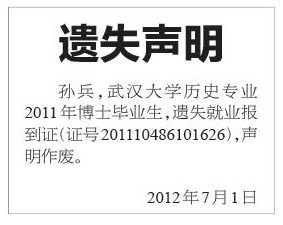 (报到证挂失登报)遗失声明登报 报到证登报声明 丢失报到证登报怎么办理 武汉大学报到证挂失登报格式