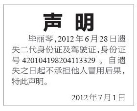 毕丽琴-身份证遗失(登报声明挂失)