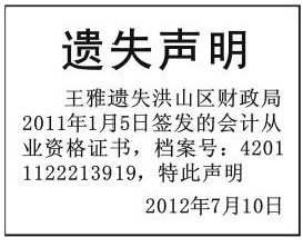 (会计从业资格证挂失声明)会计证遗失声明登报 100元 先登报再付款