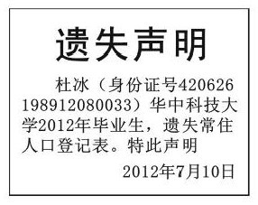(常住人口登记表遗失声明)100元 集体户口遗失声明 户口卡遗失声明 常住人口登记表丢失登报挂失声明