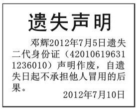 邓辉-身份证遗失(登报声明挂失)