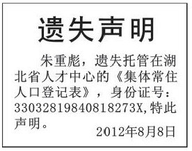 (集体常住人口登记表遗失)100元登遗失声明 先登报 再付款 方便安全 托管在湖北省人才中心的常住人口登记表丢失了怎么补办 怎么登报补办集体户口 集体户口丢失登报怎么写