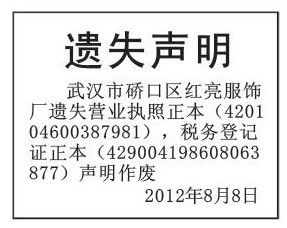 (挂失公司证件登报)营业执照遗失声明 税务登记证遗失声明 武汉公司证件丢失要登报怎么办理 怎么办理登报声明 遗失声明怎么写 公司证件丢失登报怎么弄