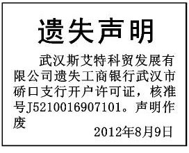 (银行开户许可证遗失声明登报)工商银行开户许可证丢失怎么登报 遗失声明登报 100元 武汉开户许可证丢失登报挂失 先登报 再付款 方便安全 快捷