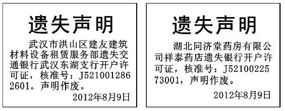 (银行开户许可证遗失声明登报格式)开户许可证挂失登报100元 先登报 再付款 武汉市银行开户许可证遗失声明登报 挂失开户许可证登报 丢失开户许可证登报