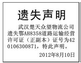 (道路运输证遗失声明登报)100元 先登报 再付款 武汉市道路运输证遗失声明登报怎么写 道路运输证丢失登报挂失费用多少 遗失声明登报 武汉遗失声明登报