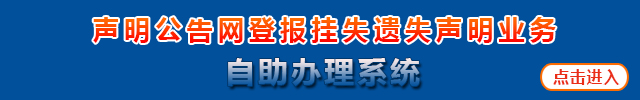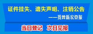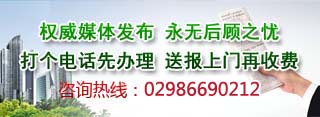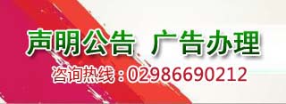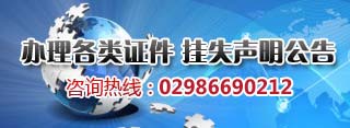 企业声明公告、注销公告、车辆手续挂失、票据作废与挂失税务登记证遗失、工商营业执照遗失、轿车合格证遗失、资格证遗失、合同遗失、公章财务章遗失、发票支票遗失、收据遗失、发票购买簿遗失、提单联单遗失、许可证遗失、台胞证遗失、护照遗失等等登报声明作废广告。 本处特约授权代理《阳光报》《三秦都市报》《西安晚报》《华商报》等强势媒体中缝和版面广告.全市最低价,服务更周到!办理电话西安咨询电话:029-86690212 86691239联系:249886883 805994605 603146198 2262998190 联系人:销售部.曾先生 【先登报后付款,信用第一!当日登记,明天见报,方便快捷!】 |