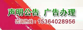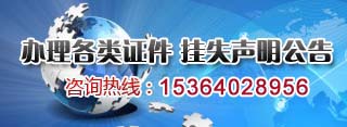 企业声明公告、注销公告、车辆手续挂失、票据作废与挂失税务登记证遗失、工商营业执照遗失、轿车合格证遗失、资格证遗失、合同遗失、公章财务章遗失、发票支票遗失、收据遗失、发票购买簿遗失、提单联单遗失、许可证遗失、台胞证遗失、护照遗失等等登报声明作废广告。 本处特约授权代理《阳光报》《三秦都市报》《西安晚报》《华商报》等强势媒体中缝和版面广告.全市最低价,服务更周到!办理电话西安咨询电话:029-86690212 86691239联系:249886883 805994605 603146198 2262998190 联系人:销售部.曾先生 【先登报后付款,信用第一!当日登记,明天见报,方便快捷!】 |